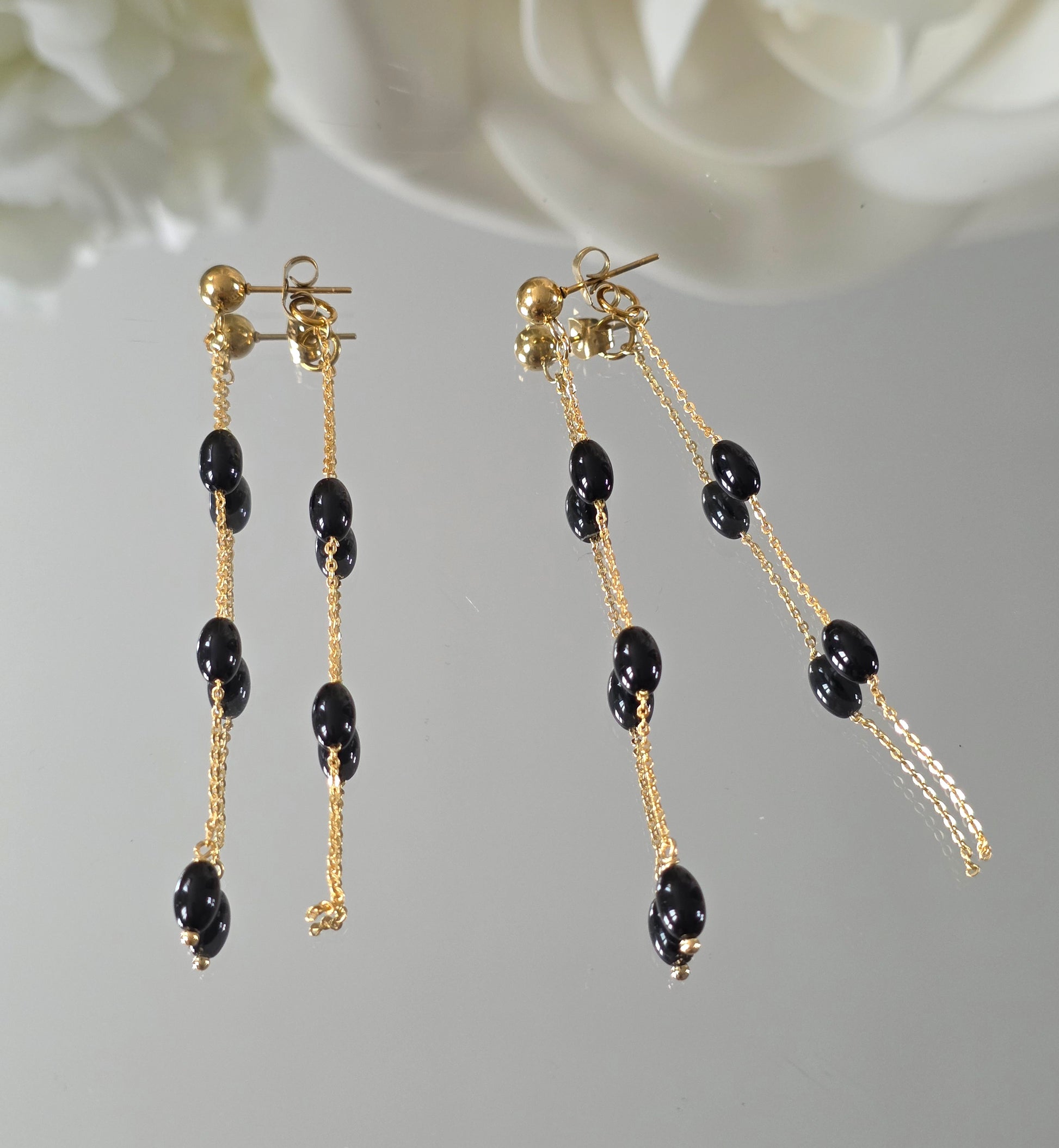 Ornementation : Les chaînes sont ponctuées de perles en cristal opaque brillant noir. La répartition asymétrique des perles sur les deux chaînes ajoute du dynamisme.